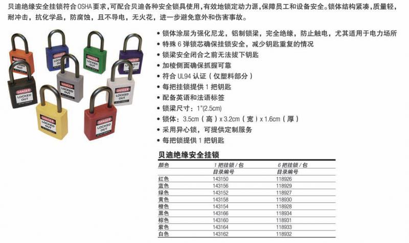 功能最強的上鎖鎖具:貝迪安全掛鎖符合所有OSHA要求,可用于安全替代上鎖過程里使用的金屬鎖具。鎖體絕緣,獨特的鎖心可防止電流從鎖梁傳至鑰匙,從而進一步提高了觸電防護性能。貝迪安全掛鎖還具有一定的防腐蝕性能。第三方檢測證明貝迪產(chǎn)品在重復鹽水噴霧試驗條件下的性能卓越。